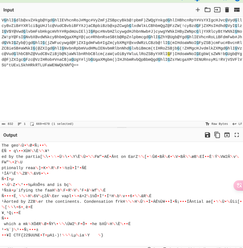 结尾等于号 猜测是base64 虽然其中有很多不属于64的字符,但尝试赛博厨子解码先