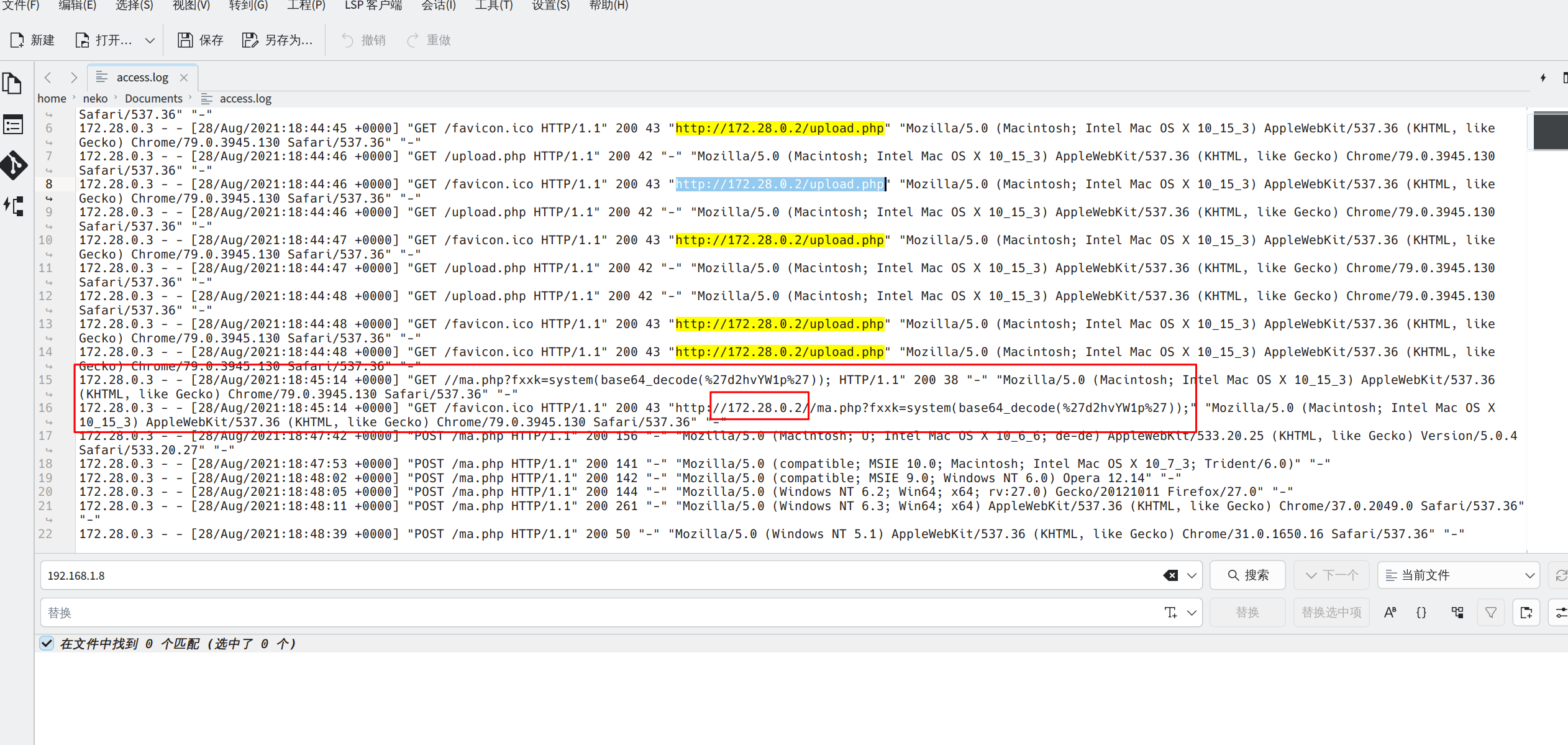 第一个ip确定,在翻了翻没有看到可疑的流量,回到log文件也没看到.8的ip,细看发现.3访问了upload文件指向的ip是172.28.0.2,不止一个hackip
