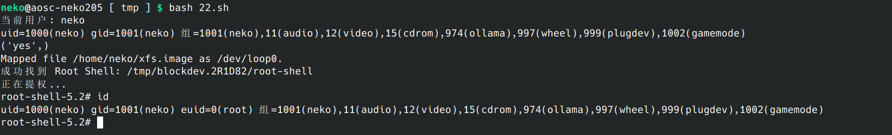 uid=1000(neko) gid=1001(neko) 组=1001(neko),11(audio),12(video),15(cdrom),974(ollama),997(wheel),999(plugdev),1002(gamemode)